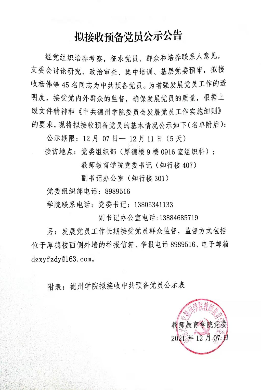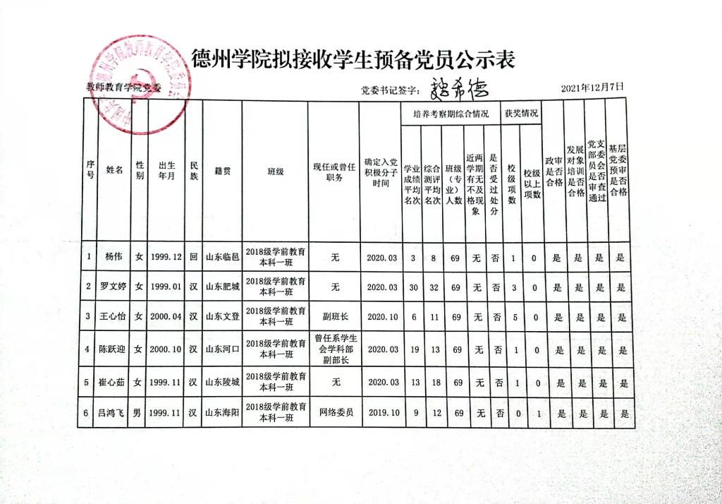 德州学院伟德国际1946源于英国拟接收学生预备党员公示表
