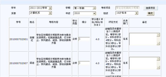 第六步:点击图3中的确定出现图5,请根据评定方式在得分项输入学分。所有必修学分在填写完所得学分后,必须在备注项中填写优、良、中、及格、不及格,否则后台系统将不能自动将学分转换为成绩进行公式计算。公式计算方式见表1。