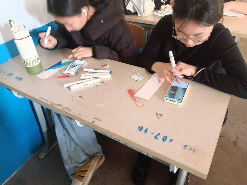 活动伊始,书画社成员向同学们展示了一系列精美的书签作品。这些书签有的以传统的水墨画为装饰;有的则搭配了精美的书法,展现出了独特的文化韵味。随后同学们开始进行制作,他们纷纷拿起工具,有的同学从诗词中汲取灵感,将诗句的意境通过书签上的图案与文字相结合呈现出来;有的同学则利用不同质地的纸张、丝带改变书签整体效果,使书签以立体的形式呈现。同学们精心裁剪纸张、绘制图案、书写文字,充分展现出他们对传统文化的热爱。活动最后还设置了互动交流环节,同学们踊跃发言,分享自己设计书签的创意构思,这种互动不仅丰富了同学们的设计思路,还增进了彼此间的情谊。