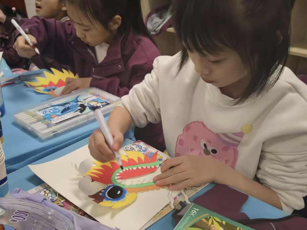 活动当天,同学们带着纸杯、剪刀、彩纸等材料早早到达了附属小学。孩子们精心挑选自己喜爱的彩色纸张,将纸张裁剪成宽度一致的长条,运用绘画工具在纸条上勾勒出精美的龙鳞图案,将纸条紧密环绕在杯子侧面,自杯底起逐层向上粘贴,构建出龙身的雏形。随后在同学们的帮助下,孩子们分别制作出龙头与龙尾,同学们耐心地指导他们如何运用剪纸技艺进行装饰,孩子们也充分发挥自己的想象力和创造力,一个个普通的纸杯和彩纸变成了栩栩如生的“纸龙”,促进了孩子们的动手能力和创造力。