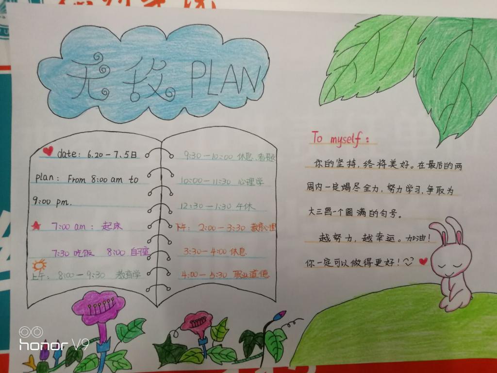 随着期末的来临,教育科学学院也进入了紧张的复习阶段,为了让同学们有合理的时间安排,教育科学学院号召广大学生制定期末计划。活动过程中,同学们将自己的学习计划与时间安排认真地写在纸上,以增强自己学习的效率。同学们根据计划要有明确的目的、学习内容和完成时间、要有保证完成学习任务的方法和措施以及从实际出发四个原则制定了属于自己的学习计划。