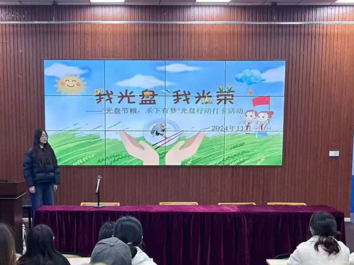 活动伊始,负责人先向同学们介绍了此次活动的目的,她表示虽然活动时间不长,但希望可以通过此活动帮助同学们养成节约的好习惯。她通过PPT上生动的图片和震撼的数据,使同学们深刻认识到浪费粮食的严重后果以及节约粮食的紧迫性,同学们节约粮食的意识再次得到了提升。随后,同学们还观看了视频,视频中农民辛勤劳作的场景以及饥饿地区人们的生活状况,使同学们备受感触。他们纷纷表示要从小事做起,从自我做起,自觉成为节约粮食的倡导者和实践者,共同维护粮食安全。在活动开展的几天里,同学们积极响应号召,以极大的热情投入到光盘行动打卡活动中。同学们那记录着光盘成果的照片,彰显着新时代大学生对珍惜粮食这一理念的深刻认知与积极践行。他们用实际行动履行着节约粮食的庄重承诺,用自己的行动为推动社会节约粮食工作贡献力量。