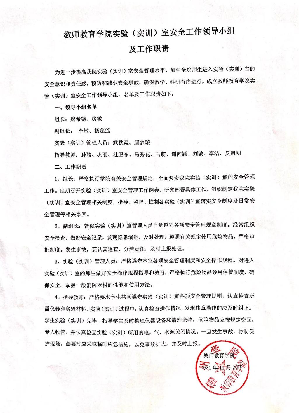 为进一步提高我院实验(实训)室安全管理水平,加强全院师生进入实验(实训)室的安全意识和责任感,预防和减少安全事故,确保教学、科研有序进行,成立伟德国际1946源于英国实验(实训)室安全工作领导小组,名单及工作职责如下: