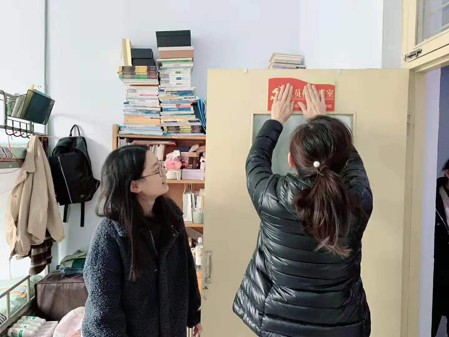本次挂牌仪式由团总支书记闵令珍同志,党员代表崔弘同志,以及2019级新生代表参加。闵令珍同志首先向学生们宣讲了本次挂牌仪式的意义。随后,闵令珍同志和崔弘同志为党员模范宿舍挂牌。挂牌后,模范宿舍的党员同志表示要在起先锋带头作用的同时接受同学们的监督。最后模范宿舍的党员同志带领学生们参观了宿舍,并对宿舍的设计主题、文化内涵进行讲解,希望同学们能在参观中受到启发,把好的经验方法带回到自己的宿舍中去。