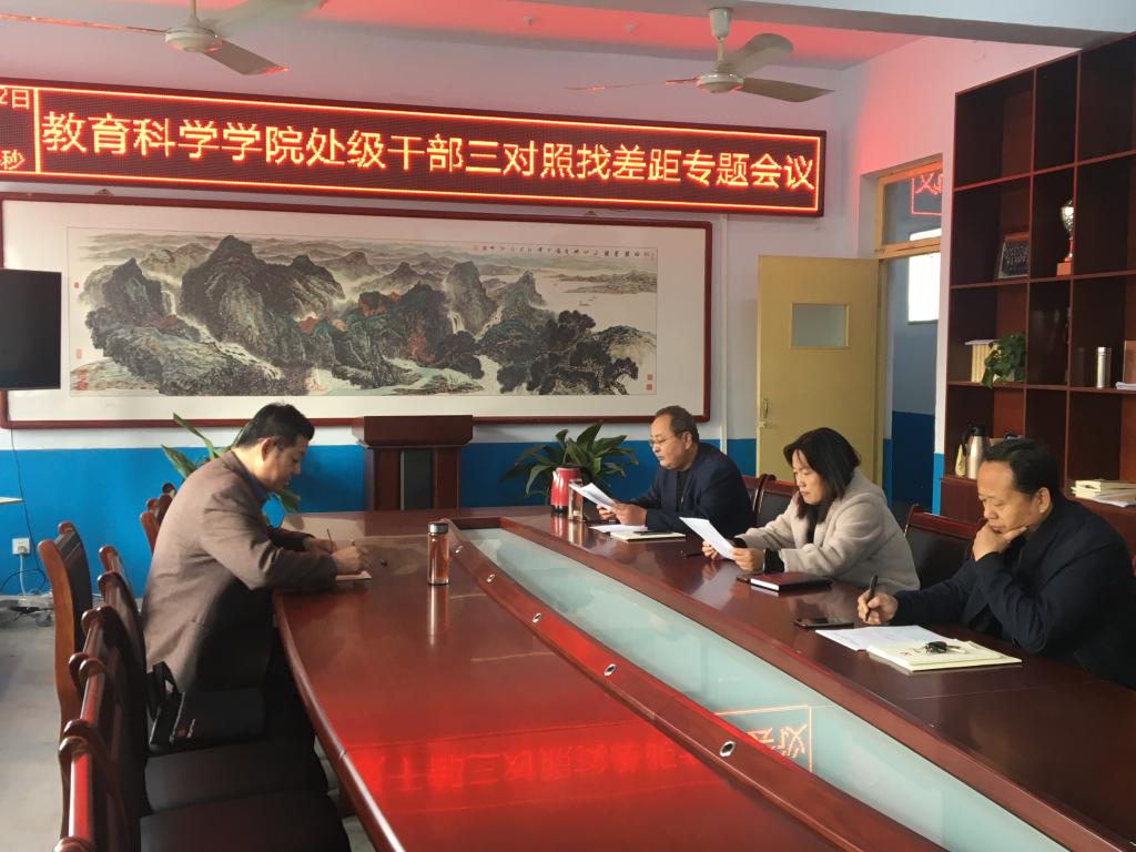 11月12日上午,按照学校“不忘初心、牢记使命”主题教育安排,教科院在会议室召开对照党章党规找差距专题会,逐条对照《中国共产党章程》《关于新形势下党内政治生活的若干准则》《中国共产党纪律处分条例》等有关党内法规,全面查找各种违背初心和使命的问题,推动主题教育不断走深走实。